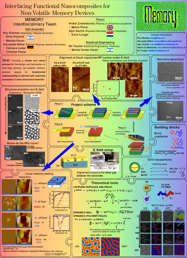 The continuous demand for device miniaturization poses technological and economic barriers that cannot be answered by current fabrication techniques. This proposal is aimed at the development of a simple technique for the fabrication of crossbar electrode arrays for non-volatile memory devices based on a modulated block copolymer/nanoparticle (BCP/NP) assembly approach, where the ability to control the interfacial interactions between the NPs and the BCP domains under an electric field is crucial for obtaining the desired structure. Through a tight collaboration between experimental chemists, theoreticians, and an electrical engineer we intend to unravel the fundamental behavior of BCP/NP assembly under the influence of a directing electric field, and then to utilize the structures formed for the creation of an ultrahigh-density, multi-component memory device.