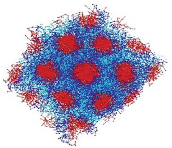 Bead-stick images of H1 phase (60%). Dark blue represents head beads, light blue represents water beads and red represents tail beads.