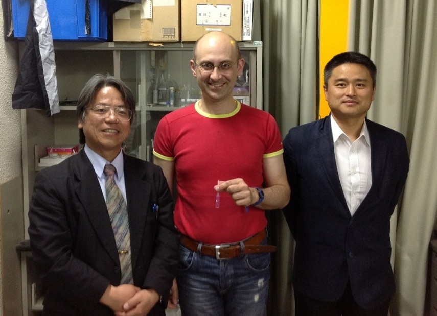 From left to right: Dr Shigeru Okamoto, Andrei holding block copolymer sample, Dr Takashi Honda
