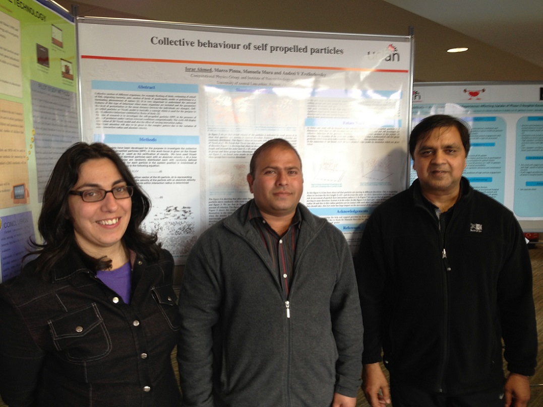 I presented my poster in annual research conference which was held from the date 2nd July to 4th July 2013 at the University of Central Lancashire, UK. It was an ideal opportunity to share findings from my project. My poster was about the collective behaviour of self-propelled particles. This was my first experience to present a poster in a conference.