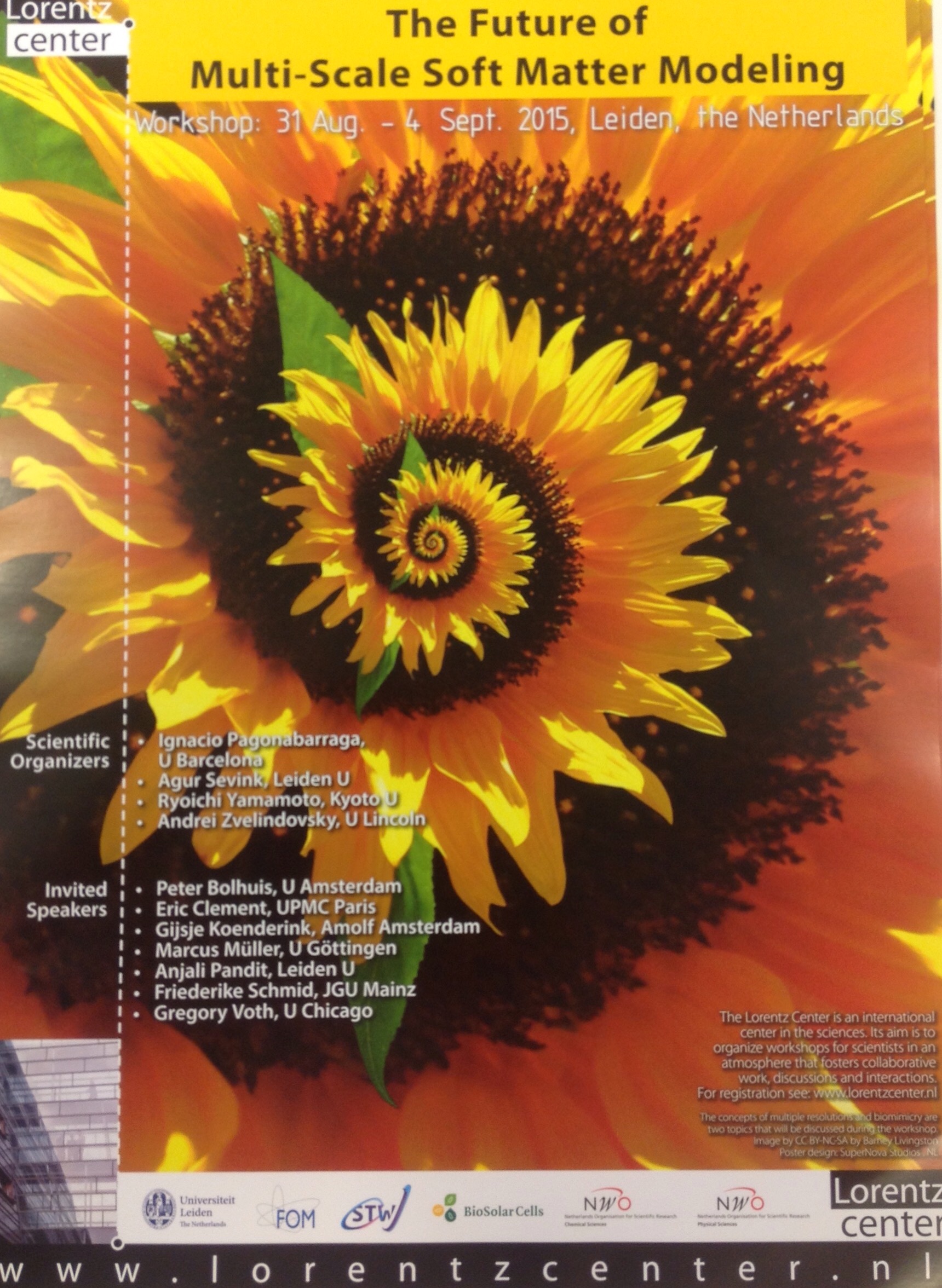 International Lorentz workshop “The future of multi-scale soft matter modeling” took place on 31.08-4.09.2015 in Leiden, Holland. Around 25 scientists, including PhD students, took part in intensive program comprising of lectures, poster and oral presentations and extensive Q&A and discussion sessions. The discussed simulation methods ranged from quantum and full atomistic molecular dynamics to various coarse grained techniques. Several experimental talks gave a basis for discussing future simulation challanges. Application focus of the workshop was on various soft and biological materials and systems. Fabien and Andrei took part in the symposium.