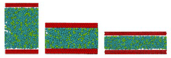 Fig. 1a) The simulated films of random copolymer chains confined between two crystalline walls. Three different values of the film thickness were used in the simulations. For thinner films, larger lateral dimensions were used so as to maintain a constant density. Distinct colors denote different bead types.