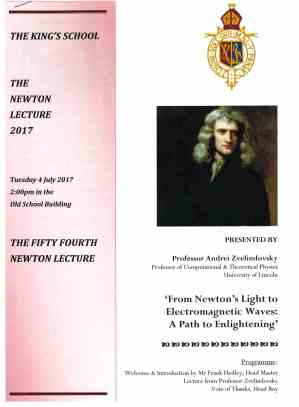 On Tuesday 4th of July 2017 Professor Andrei Zvelindovsky, the founding head of the School of Mathematics and Physics at the University of Lincoln, gave a lecture ‘From Newton’s Light to Electromagnetic Waves: A Path to Enlightening’ at the King’s School in Grantham. The school was founded in 1528 and attended by Isaac Newton. The lecture was 54th Newton lecture with the first one being in 1960. Andrei’s talk described ideas of light, from Newton’s concept of colour to the modern description of electromagnetic waves and their multiple applications. The lecture was attended by the students, staff and members of the Board of Governors and was followed by the Vote of Thanks from the Head Boy during which Andrei was presented with an “Newton apple”.
