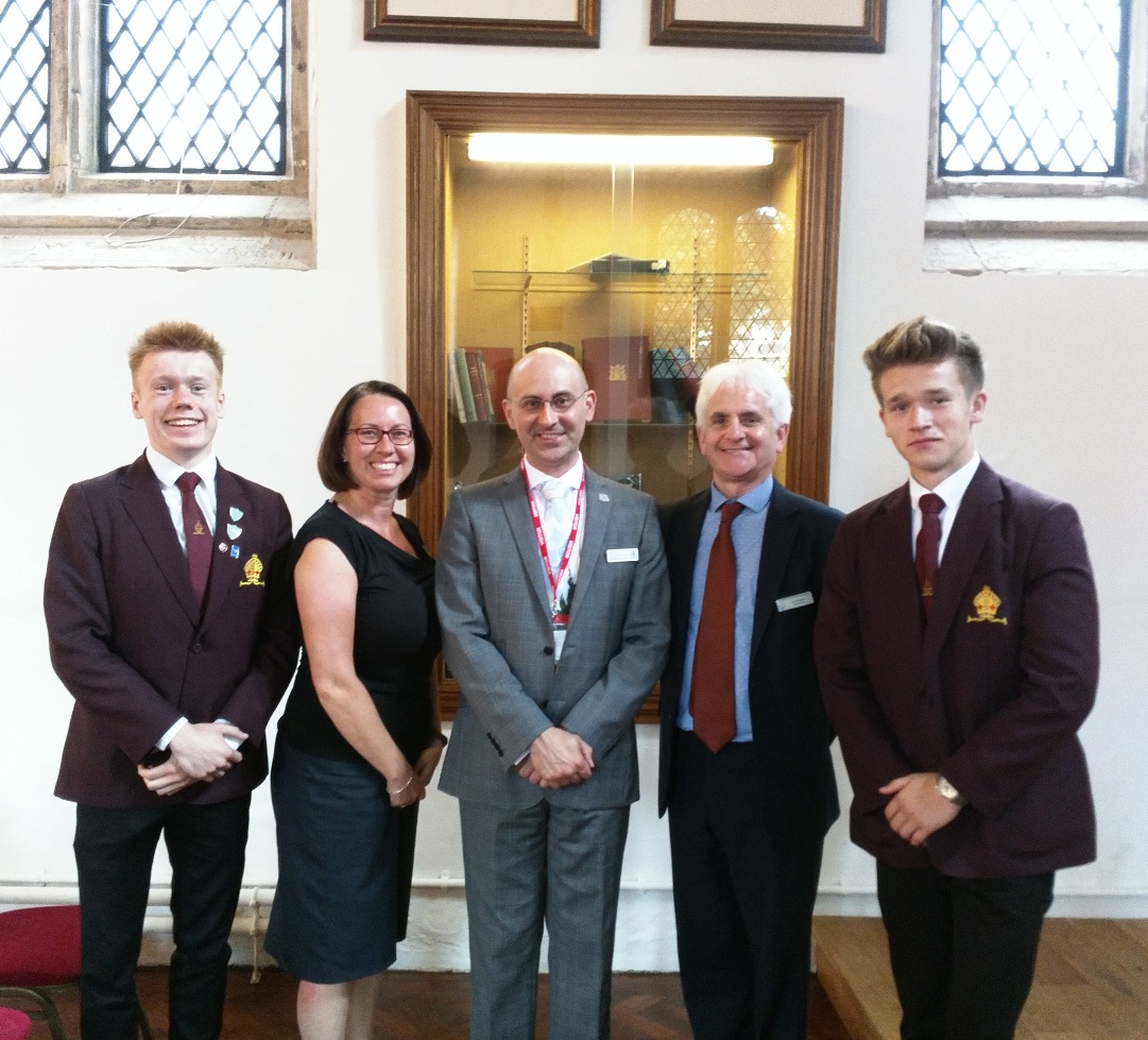 After the lecture. L-R: Oliver Jakes (Head Boy), Miss Sara Jones (Subject Leader, Physics), Prof Andrei Zvelindovsky, Mr Frank Hedley (Head Master) and Matthew Dixon (Deputy Head…