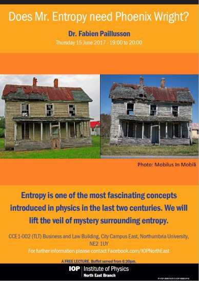 The rather curiously titled lecture comes about because Entropy is often accused of being the origin of disorder in the Universe and “Phoenix Wright” is a fictional lawyer who often has to deal with “hopeless” cases as Fabien explained.