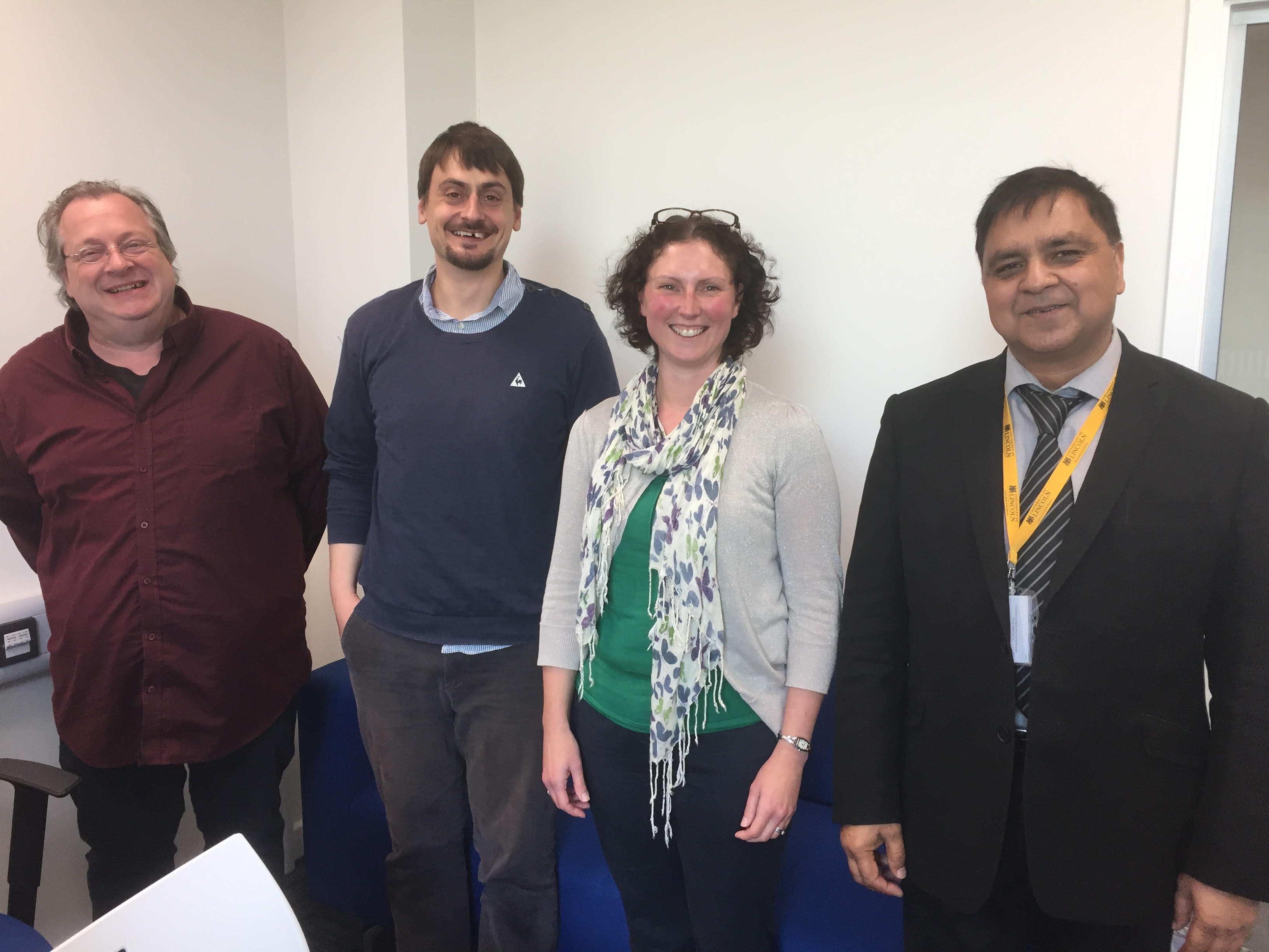 After the viva with the panel. L-R: Prof Nicholas Blagden (viva chair), Dr Gilberto Teobaldi (external examiner, University of Liverpool), Fiona Bissett and Prof Waqar Ahmed (internal examiner).