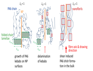 ystallites occurring in the unmodified fibres, but induce crystallisation of folded chain γ PA6 lamellae on their aligning surface sites resulting in orthogonal growth perpendicular to the fibre axis and the formation of nanohyrid shish-kebab structures. Mechanical drawing causes delamination of the formed lamellae and shish nucleation in the bulk. This leads to an unprecedented microstructural transition from nanolamellar (kebab-like) to nanofibrillar (shish-like) structures, that is held up with increasing NCP loadings. The total crystallinity can be described within the Avrami model by a 2D decompostion of the nanolamellae followed by bulk crystallisation of the nanofibrils. The mor-phological transition observed precedes the strain induced structural transformation from the γ to the α PA6 polymorph that is retarded in the equatorial plane in the NCP presence. The present findings have a strong impact on establishing structure-property relationships and in designing advanced materials with polymeric or nanohybrid shish-kebab structures.