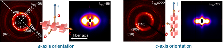 Shish-kebab structures are known to develop after cessation of flow from semicrystalline polymer melts and/or upon uniaxial drawing in the processing of polymer films and fibres. The prenucleating shish is commonly assumed to align with the flow direction inducing orthogonal crystallisation of kebab-forming folded chain lamellae. Here we combine results from transmission electron microscopy (TEM), wide angle X-ray diffraction (WAXD) and/or small angle X-ray scattering (SAXS) to follow the microstructural evolution of the fibres upon drawing. For the high density polyethylene (HDPE) fibres we evidence for the first time a horizontal alignment of the main part of the shish-kebab nanostructures and therewith a meridional crystallographic a-axis alignment at a moderate extrusion rate. A crystalline a-axis orientation has so far only been reported for helically twisted kebabs, whereby the a- and c- (chain direction) axes rotate around the b-axis (chain fold direction). In our case flat shish-kebabs align perpendicular to the flow direction due to a diverging extensional flow at the end of the spinneret as predicted by Trebbin et al [1]. Increasing winding speeds induce, due to the unidirectional pulling on the surrounding polymer chains, a gradual azimuthal reorientation and finally an axial up-right standing of the shish-kebabs (axial and meridional c-axis alignment). Crystal dimensions and orientation distributions determined from an extended WAXD analysis are used to model the two-dimensional SAXS intensities. The structural evolution of the polyamide 6 (PA6)/clay nanohybrid fibres depends significantly on the amount of organically modified nanoplatelets (NCPs), that are exfoliated and axial aligned in the as-spun fibre. NCPs impede formation of shish-like γ PA6 cr