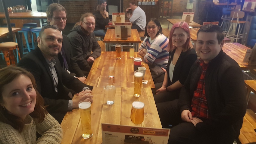 Dayna Grimsham (2nd right) celebrating afterwards in the student union with the external examiner Dr Mohamed Alhnan (King’s College London, 2nd left) and internal examiner Martin Greenall (3rd left)