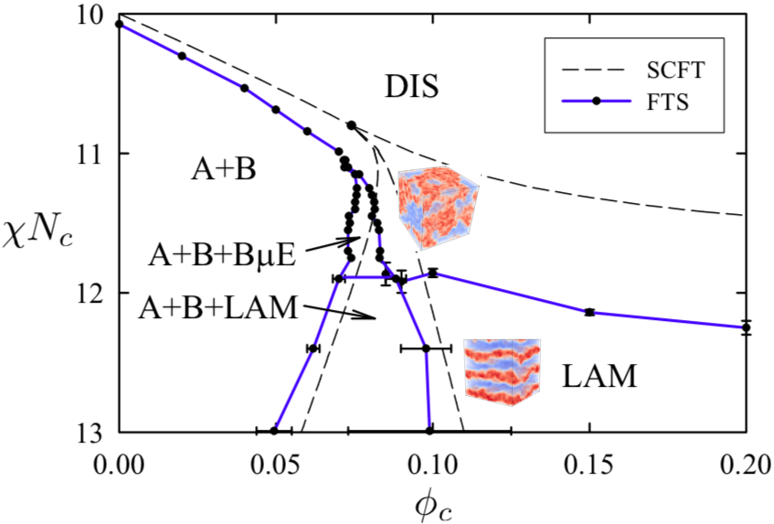 Abstract: Field theoretic simulations are used to predict the equilibrium phase diagram of symmetric blends of AB diblock copolymer with A- and B-type homopolymers. Experiments generally observe a channel of bicontinuous microemulsion (BμE) separating the ordered lamellar (LAM) phase from coexisting homopolymer-rich (A+B) phases. However, our simulations find that the channel is unstable with respect to macrophase separation, in particular, A+B+BμE coexistence at high T and A+B+LAM coexistence at low T. The preference for three-phase coexistence is attributed to a weak attractive interaction between diblock monolayers.