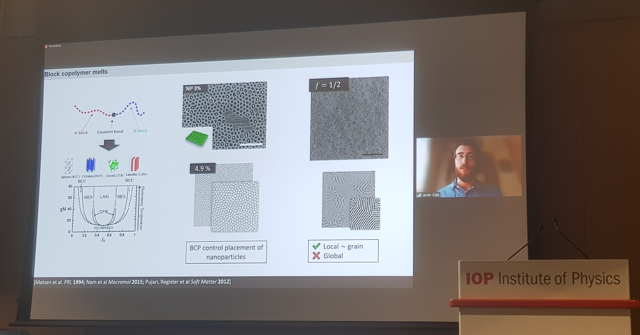 The Institute of Physics in London hosted the Physical Aspects of Polymer Science meeting from 7 – 9 September 2022, and Bart Vorselaars and Martin Greenall both gave talks at the event. Bart presented results demonstrating how a simulation method that includes compositional fluctuations can model effects in polymer blends that simpler techniques cannot, and Martin’s talk centred on a recent collaboration with experimentalists on producing polymer samples with very small-scale structure. A Lincoln PhD graduate, Javier Díaz, now in Lausanne, also presented work at the conference, giving a remote talk on the effect of flow on the microscopic patterns formed by polymers.
