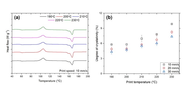 Abstract: Semicrystalline polymers are an attractive feedstock choice for material extrusion (MatEx)-based three-dimensional printing processes. However, the printed parts often exhibit poor mechanical properties due to weak interlayer strength thereby limiting the widespread adoption of MatEx. Improved interlayer strength in the printed parts can be achieved through a combination of process parameter selection and material modification but a physics-based understanding of the underlying mechanism is not well understood. Further, the localized thermal history experienced by the prints can significantly influence the strength of the interlayer welds.